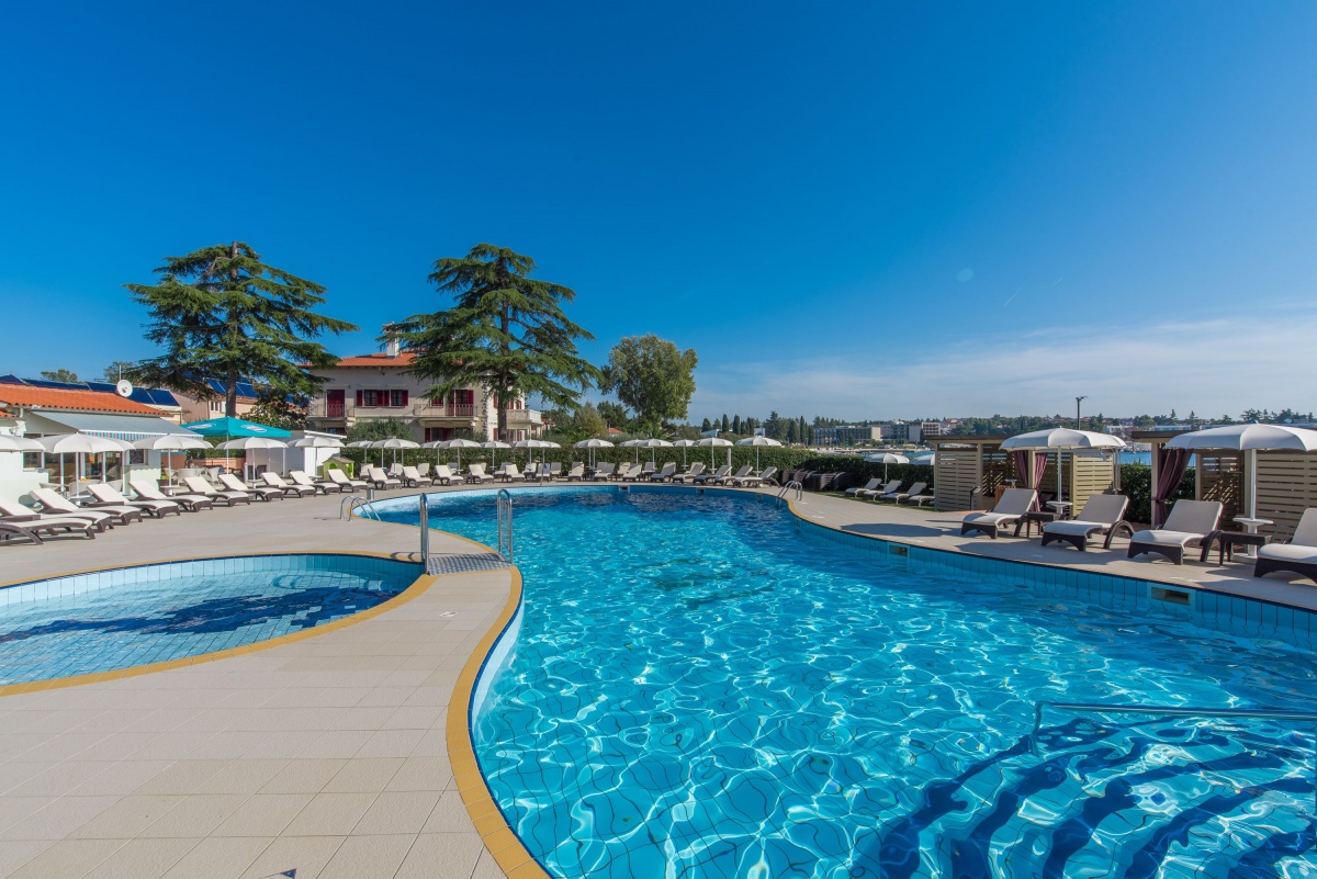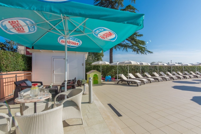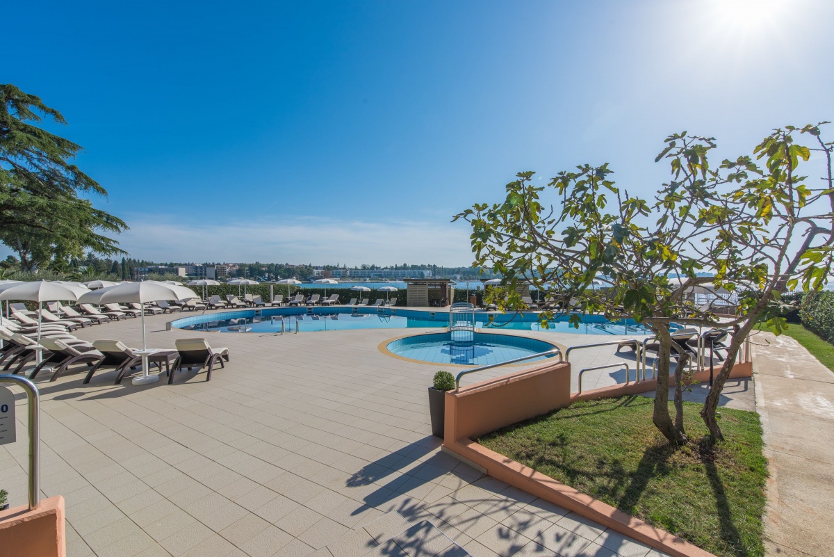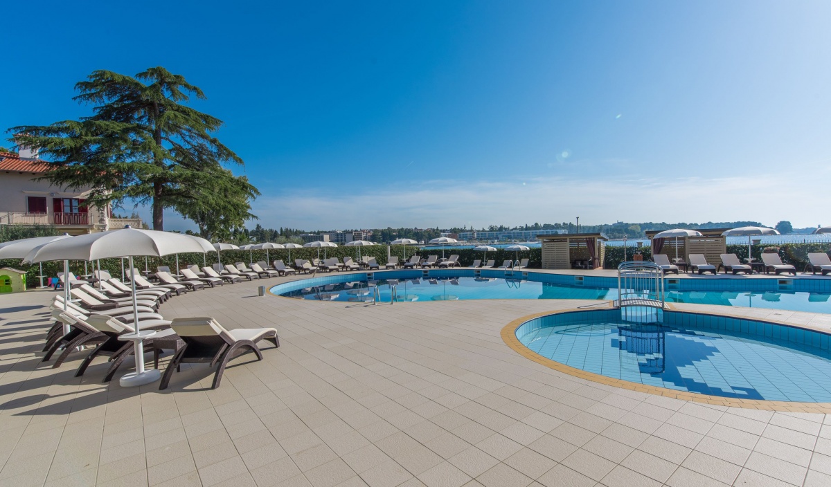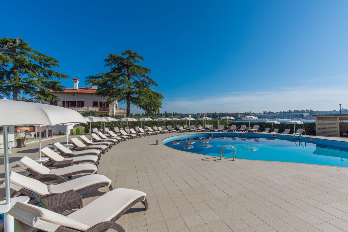 Neben dem Swimmingpool, auf der geräumigen Terrasse stehen Sonnenschirme und Liegestühle zur Verfügung, aus der einen Blick auf die Bucht und die Stadt Porec anbietet.