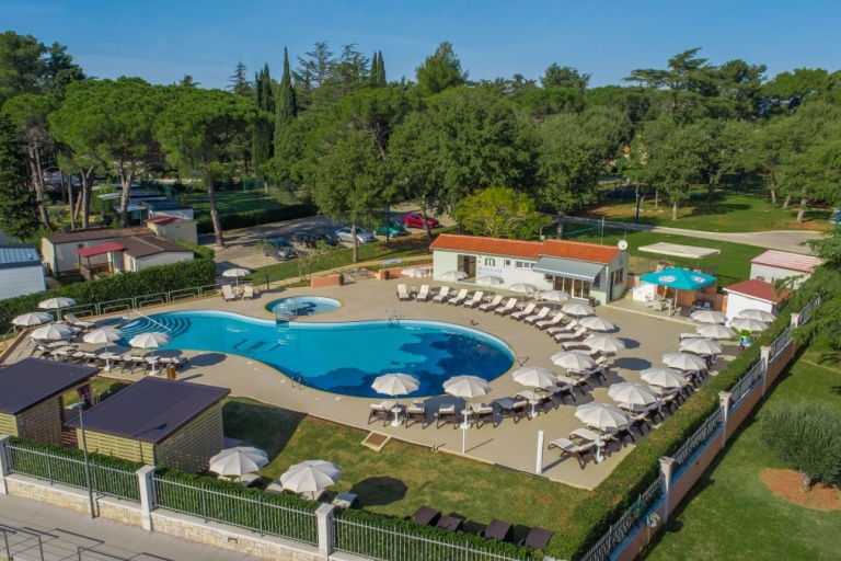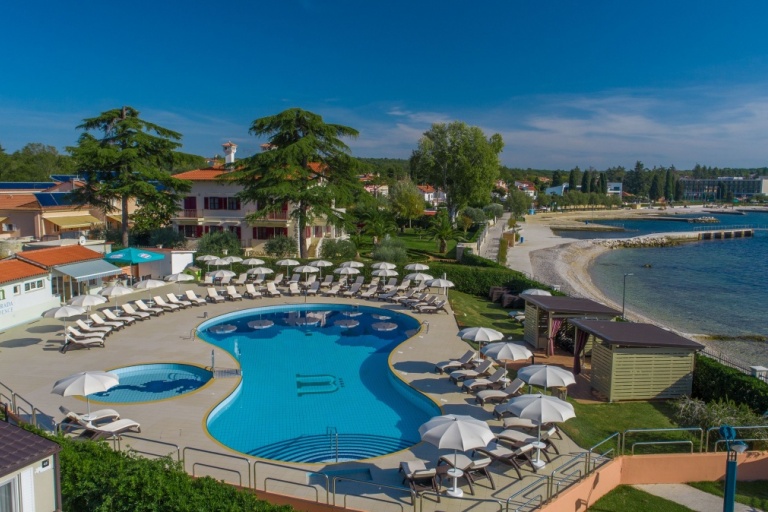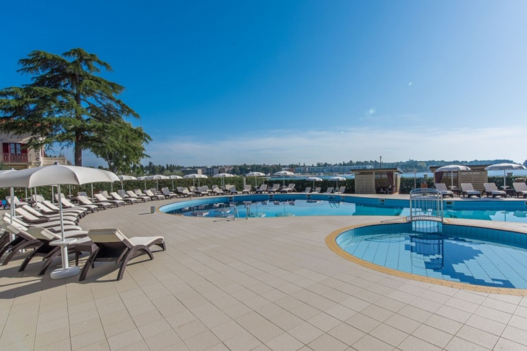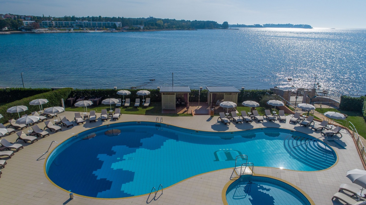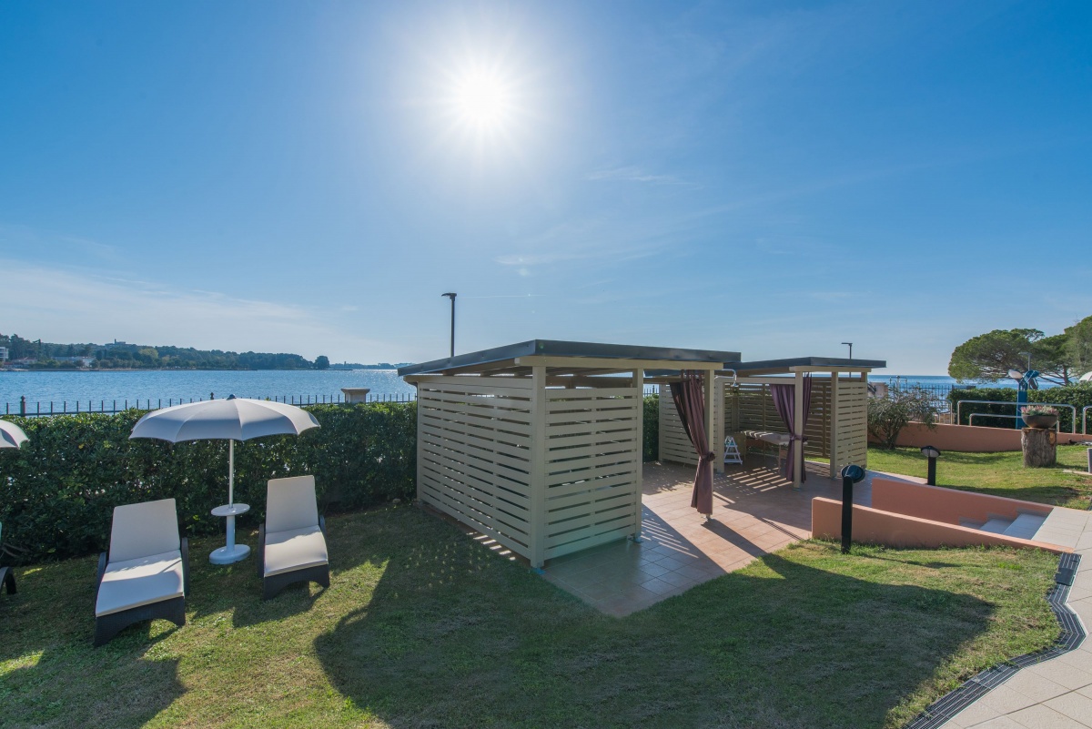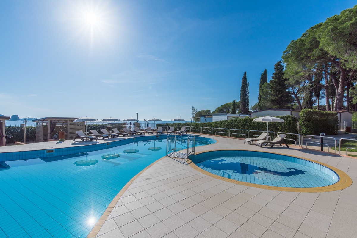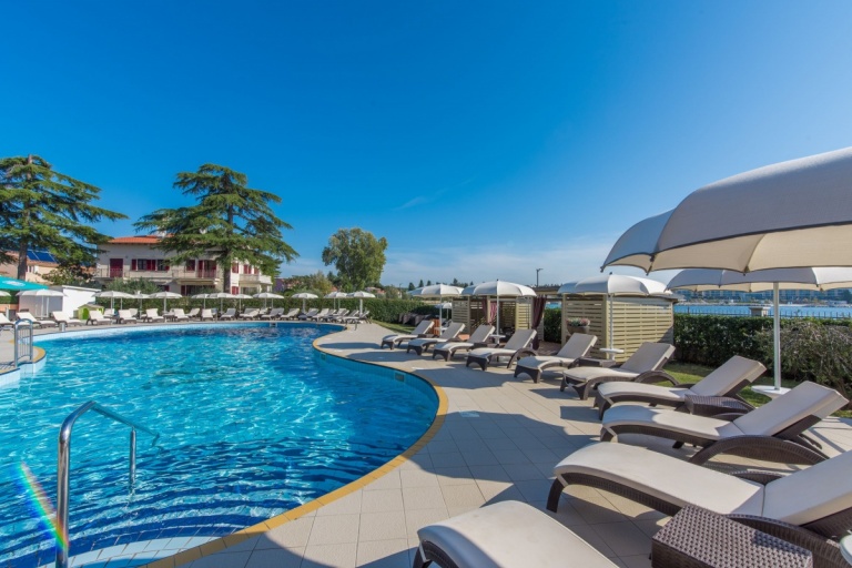 Neben dem Swimmingpool, auf der geräumigen Terrasse stehen Sonnenschirme und Liegestühle zur Verfügung, aus der einen Blick auf die Bucht und die Stadt Porec anbietet.