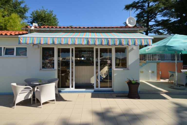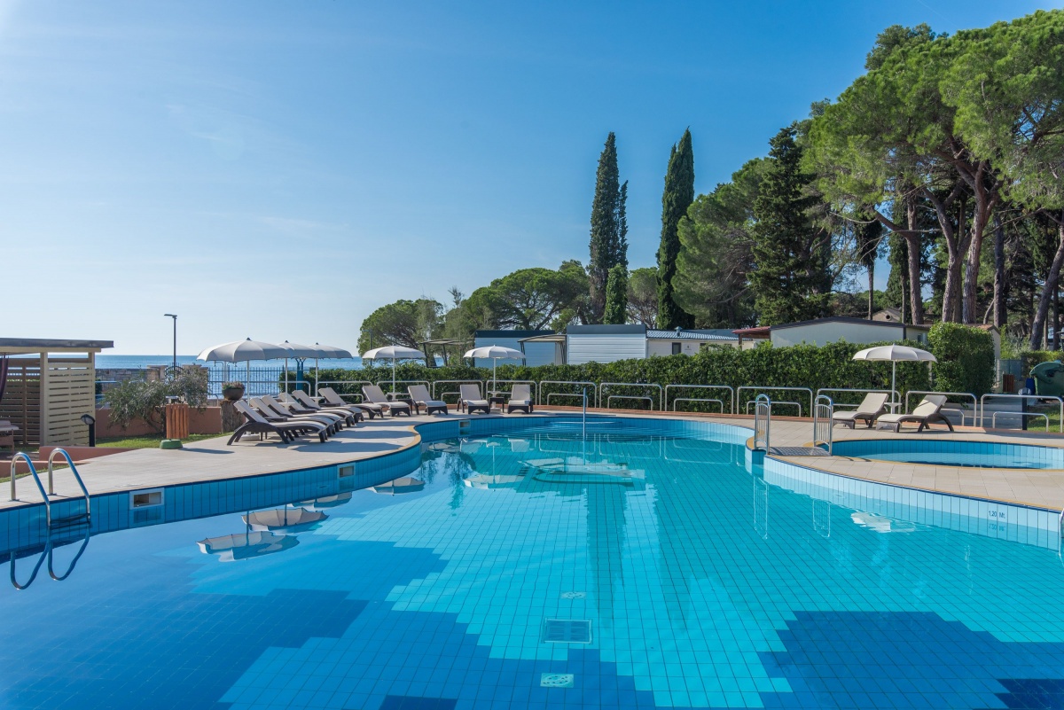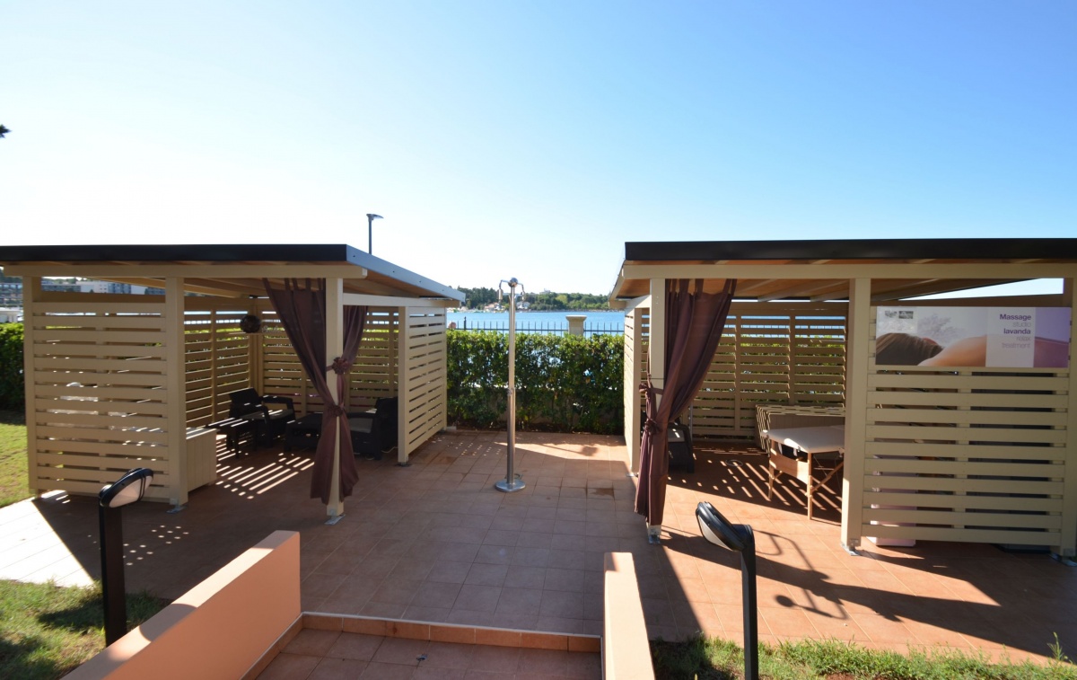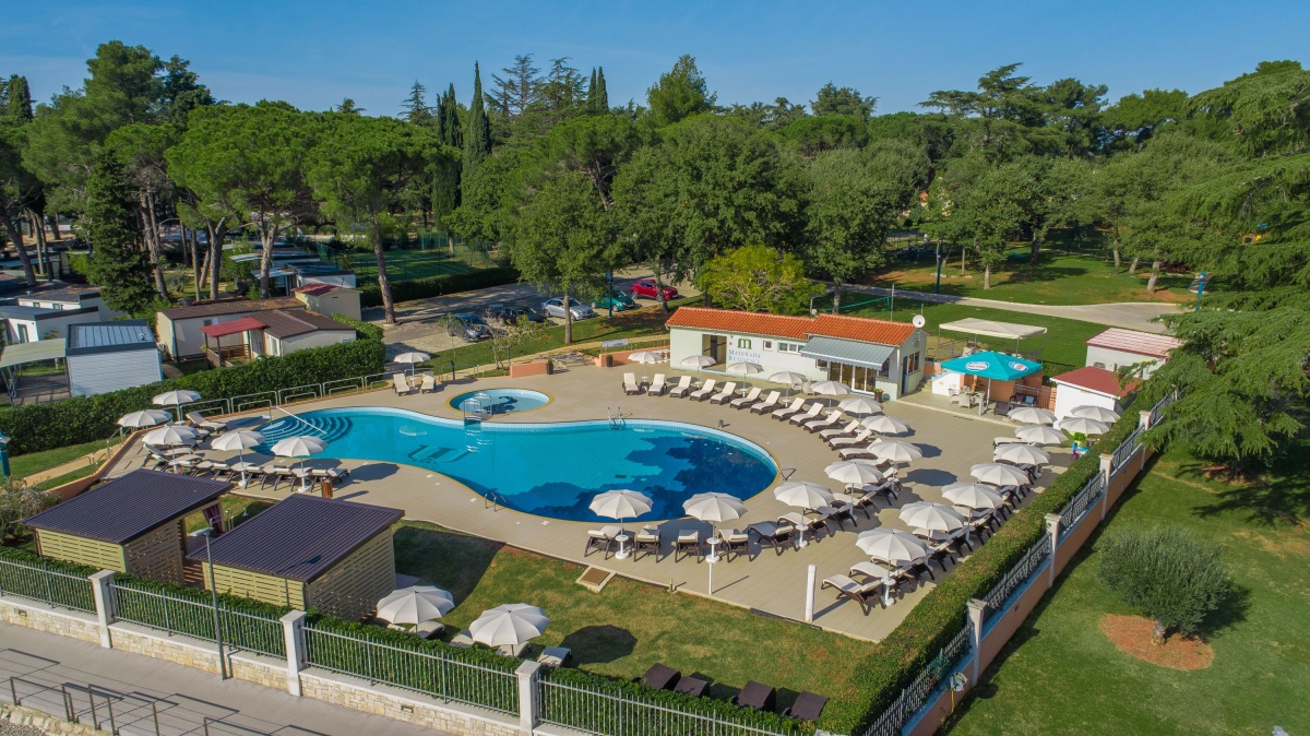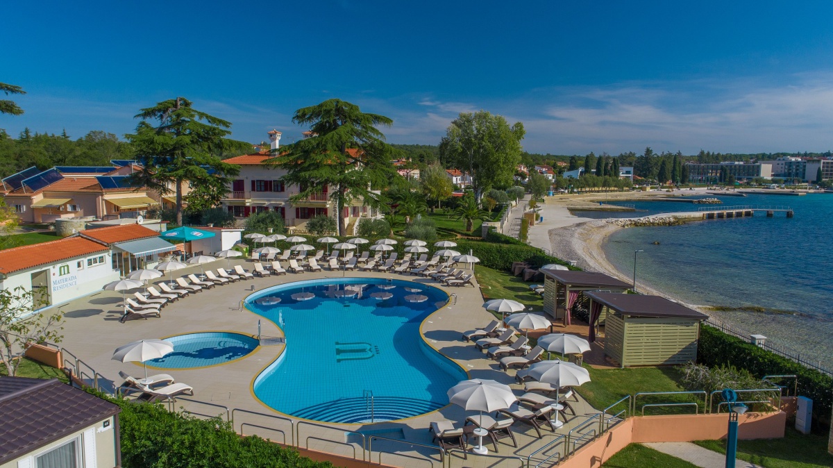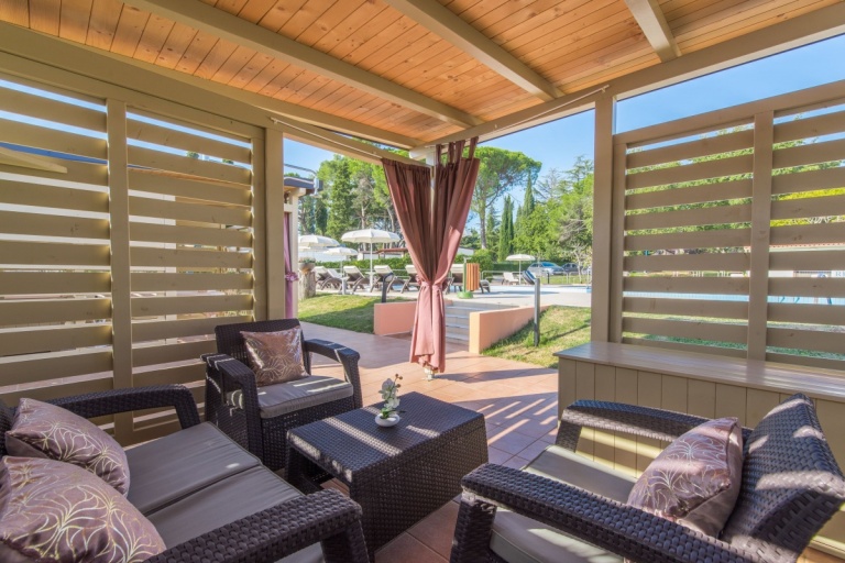 Neben dem Swimmingpool, auf der geräumigen Terrasse stehen Sonnenschirme und Liegestühle zur Verfügung, aus der einen Blick auf die Bucht und die Stadt Porec anbietet.